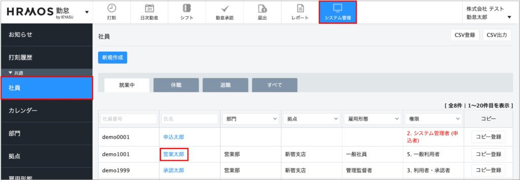 [システム管理>社員]画面へ遷移し、オリジナル時間帯集計を行いたい社員のテキストリンクから編集を行います。
