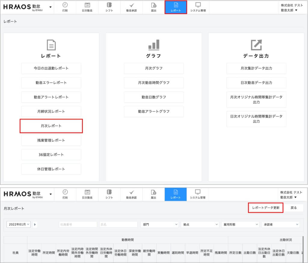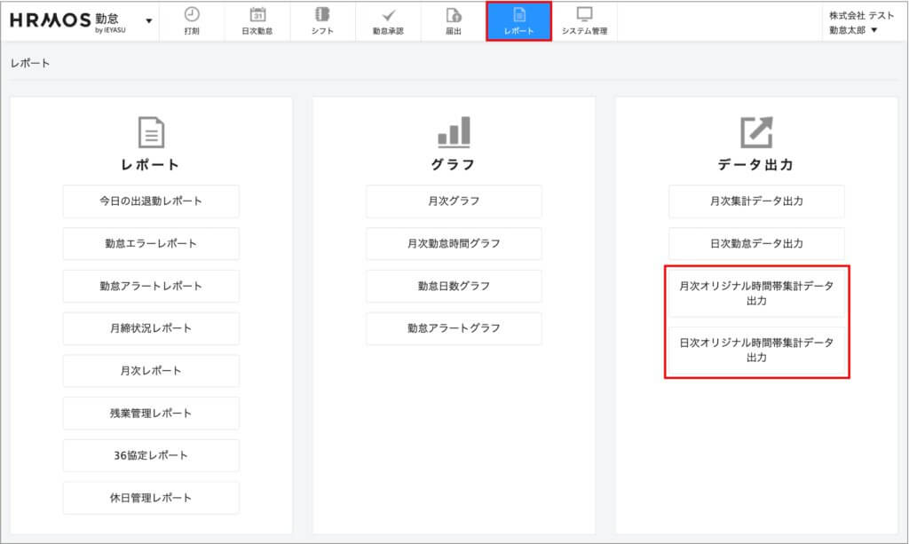 [システム管理>勤怠設定>オリジナル時間帯集計タブ]画面でオリジナル時間帯を登録した時点で、レポート画面に「月次オリジナル時間帯集計データ出力」「日次オリジナル時間帯集計データ出力」が追加されます(詳細は「【運用方法】オリジナル時間帯集計機能」の段落をご覧ください)。