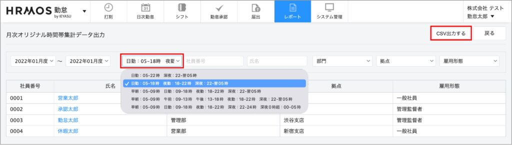 [システム管理>勤怠設定>オリジナル時間帯集計タブ]画面で設定したオリジナルの時間帯ごとに勤務時間を集計し、csvデータで出力できるようになります。