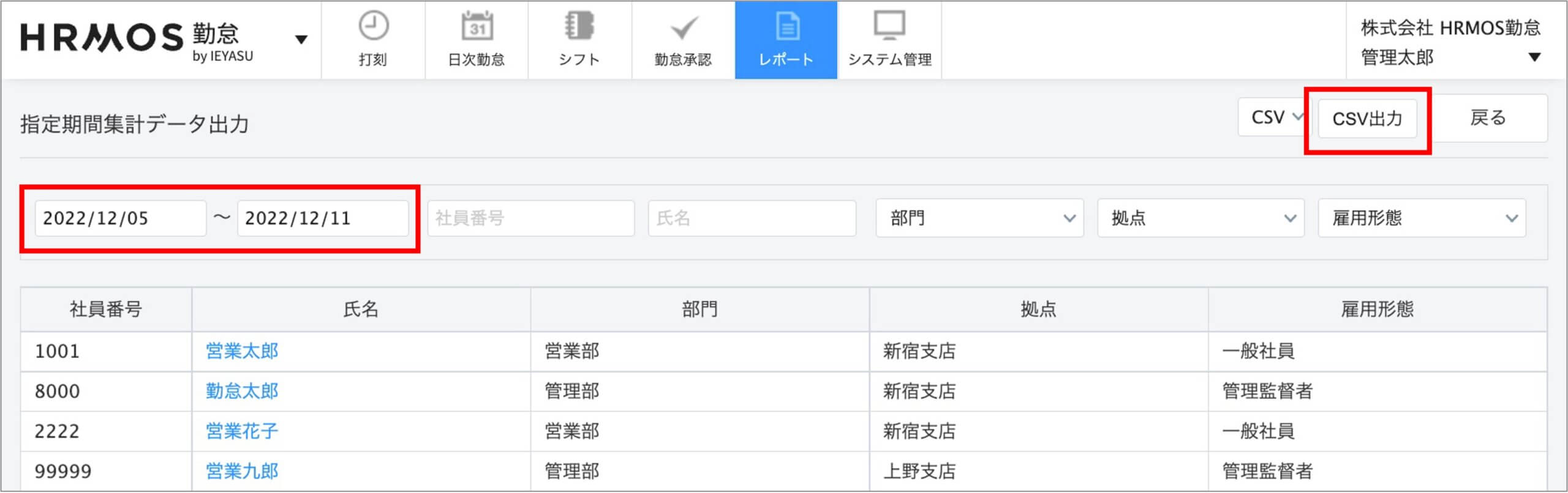 今までは1ヶ月単位での集計データしか出力できなかったため、「先週1週間」「15日間」「1ヶ月半」などの期間でデータを集計するためには、日次勤怠データをcsv形式で出力し、Excel上で指定期間のみを集計する必要がありました。