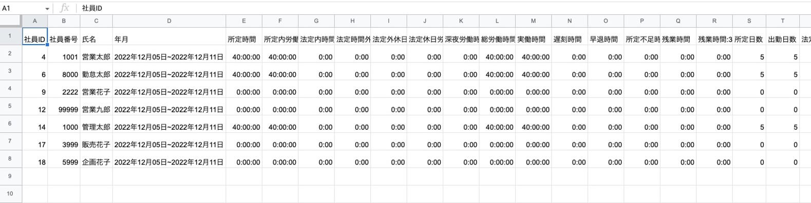 出力されたcsvデータでは、指定期間の各項目の集計値が1人1行ずつで出力されます。