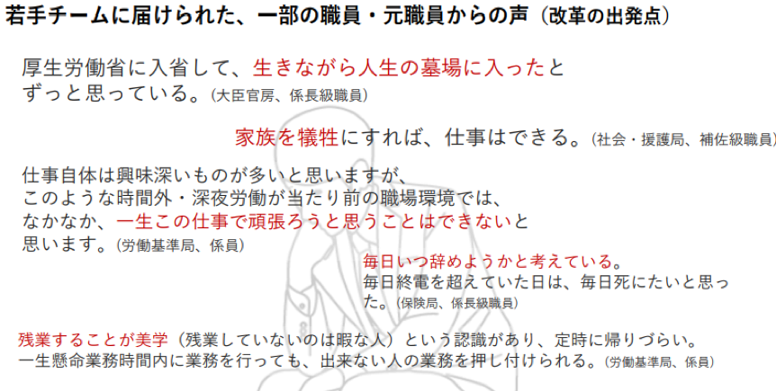 問題提起したのは、厚生労働省内の20代、30代を中心とした若手チーム。2019年8月に緊急提言として公開された資料は、「厚生労働省に入省して、生きながら人生の墓場に入ったとずっと思っている。」という、職員の衝撃的な一声から始まります。
