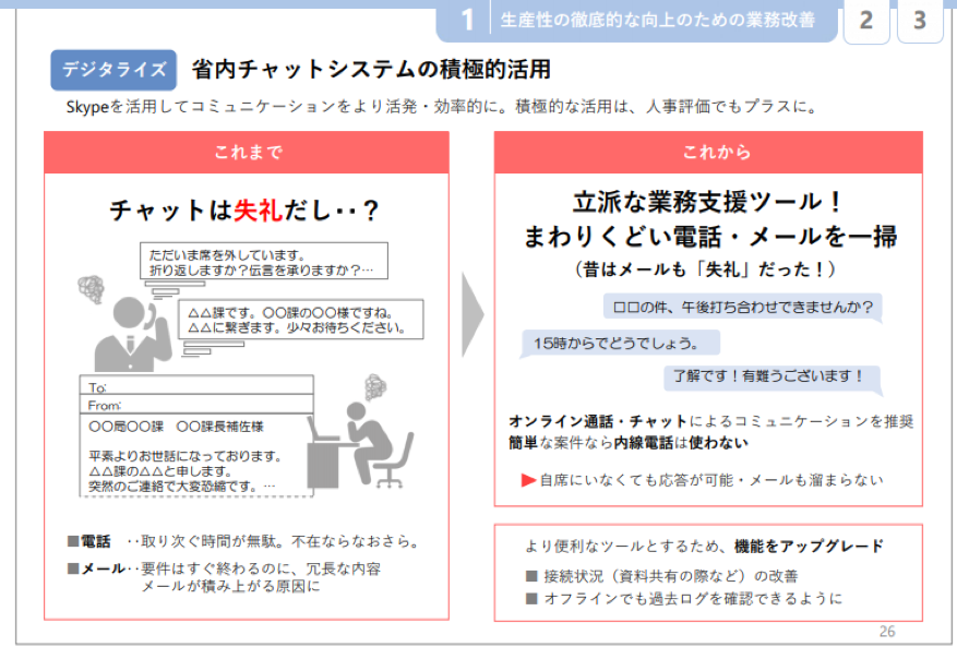 提言の内容は、一般企業においても課題となりやすい点が中心となっており、御社の働き方改革推進にもお役立て頂けるものばかりです。「国と民間では状況が違うだろう」と決めつけず、まずはご一読いただければと思います。例えば、業務連絡の簡略化については、「チャットシステムの積極的活用」が提案されています。