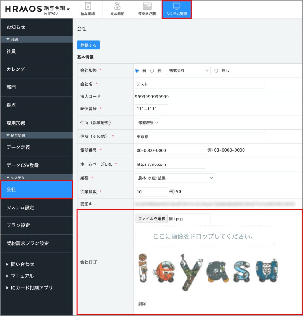 会社のロゴは、[システム管理>会社]画面よりご登録ください。