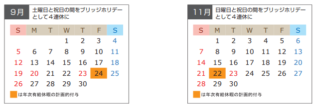 暦の関係で休日が飛び石となっている場合に、休日の橋渡し(ブリッジ)として計画的付与制度を活用し、連休とします。