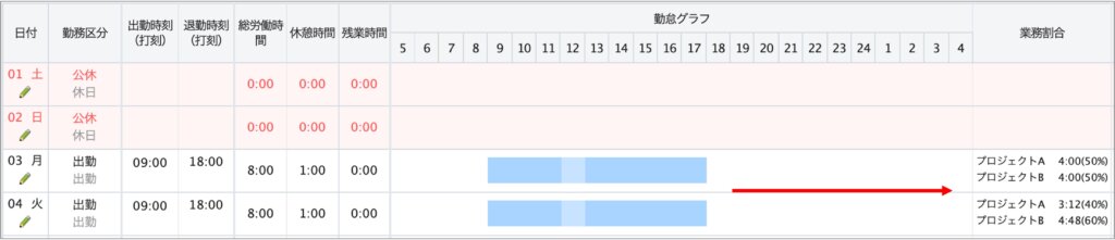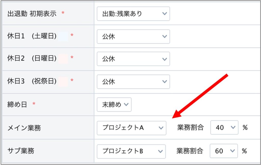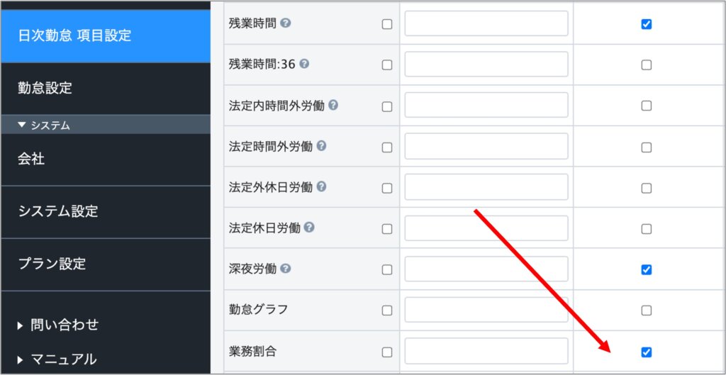 こちらにて「業務割合」にチェックを入れていただくことで、「日次勤怠」画面で業務の項目が表示されるようになります。