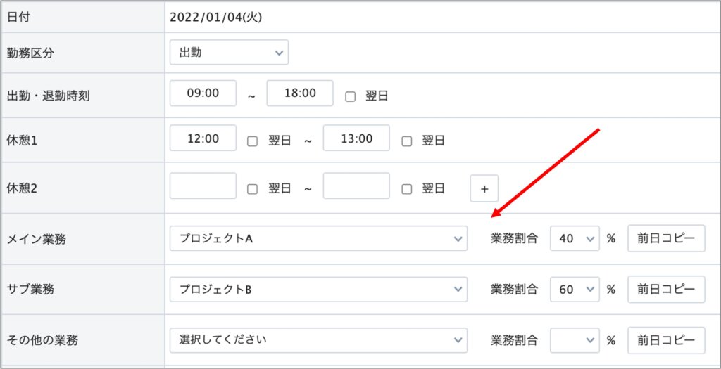 これまでの設定を完了すると、利用者の日次勤怠画面に「メイン業務」「サブ業務」「その他業務」が表示されるようになります。