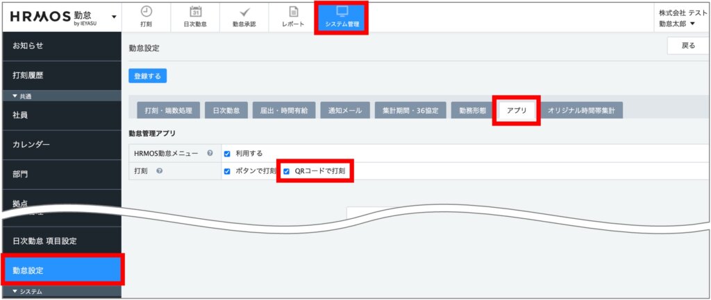 [システム管理>勤怠設定>アプリタブ]画面にある「QRコードで打刻」にチェックを入れます。