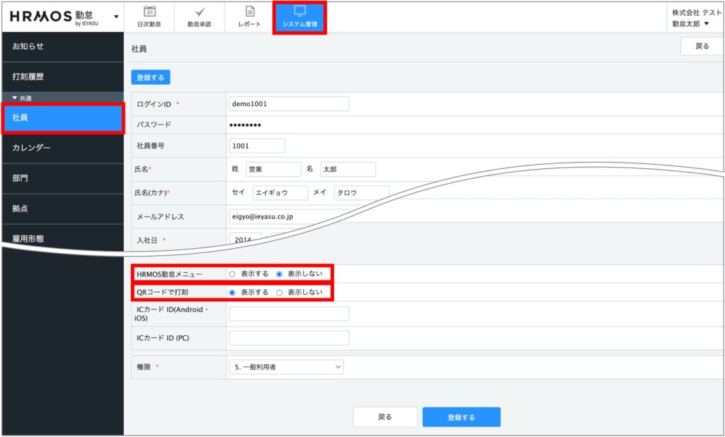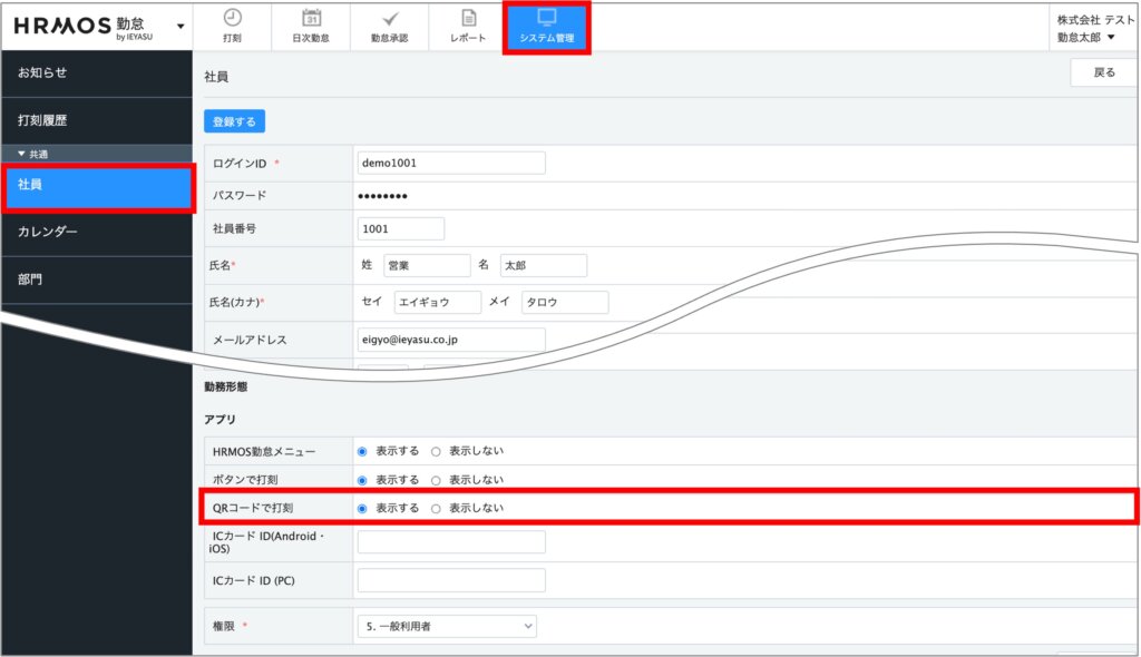 【設定3】社員画面からQRコード画面表示を個別設定(管理者)