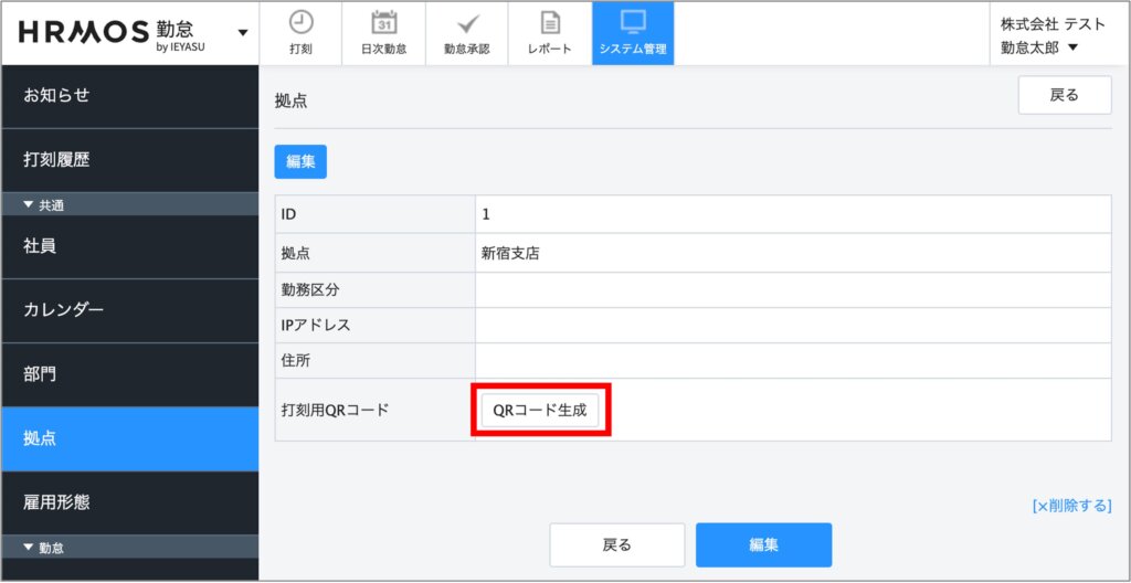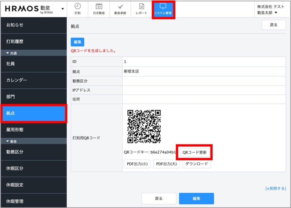 [システム管理>拠点]画面の、QRコードを生成した拠点のテキストリンクをクリックします。この画面にある「QRコード更新」というボタンをクリックすると、その拠点のQRコードが更新されます。