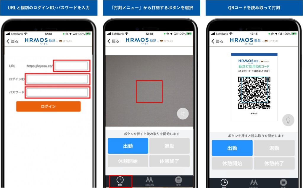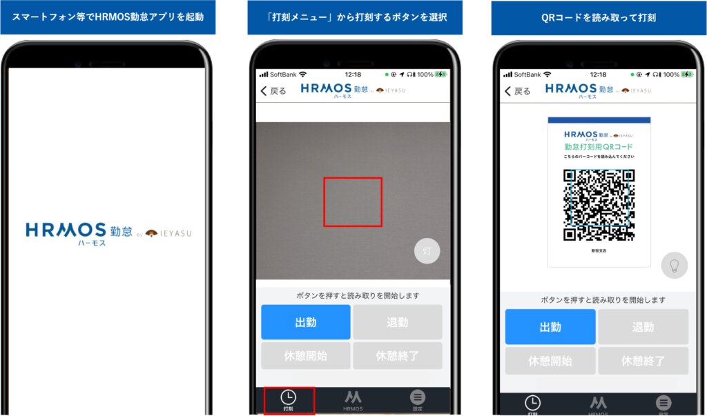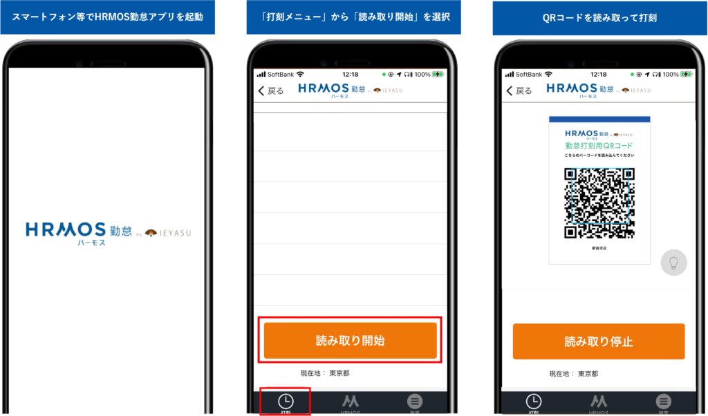 従業員は、自身のスマートフォンで「HRMOS勤怠利用者用アプリ」を立ち上げ、事業場に掲示されたQRコードを読み取って打刻します。