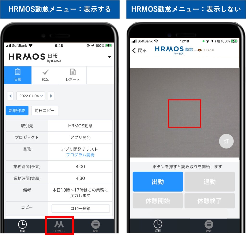 このチェックを外すと、アプリに「HRMOS勤怠メニュー」が表示されなくなり、アプリからはQRコード打刻しかできなくなります。
