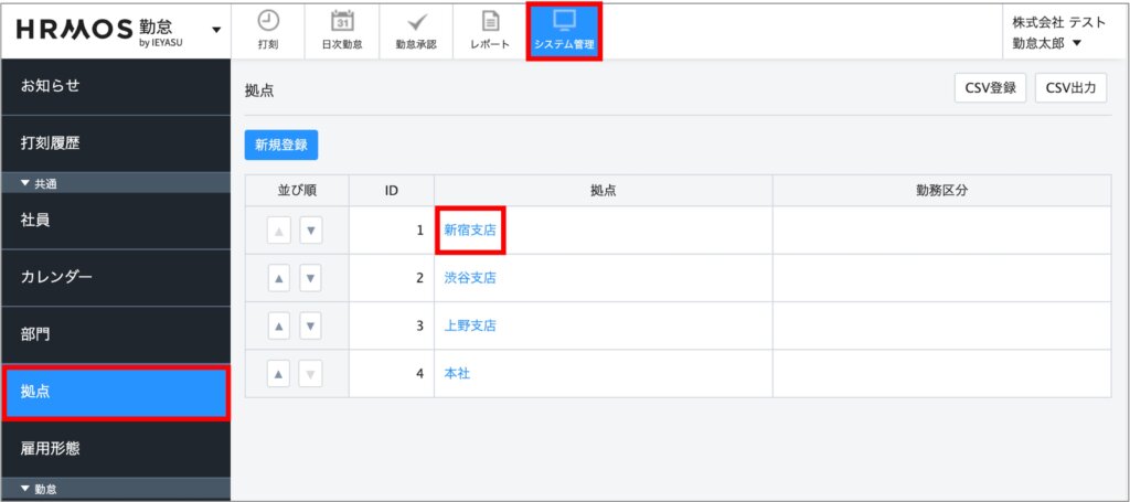 [システム管理>拠点]画面よりQRコードを生成します。まず、QRコードを生成する拠点のテキストリンクをクリックします。
