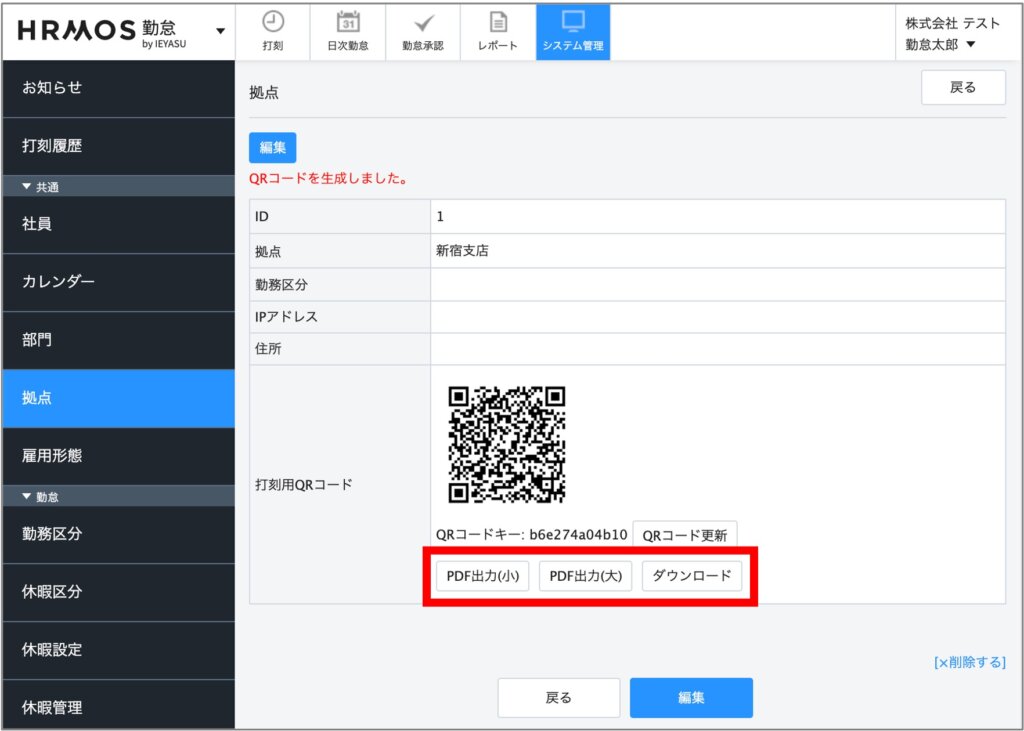 「QRコード生成」ボタンをクリックすると、その拠点に紐づいたQRコードが生成されます。