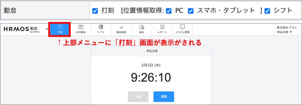※1「上部メニュー」項目内の「勤怠」において「打刻」のチェックを外すことによって、パソコンのブラウザからハーモス勤怠へログインした場合に、上部メニューの「打刻」画面が表示されなくなり、パソコンからは打刻ができなくなります。