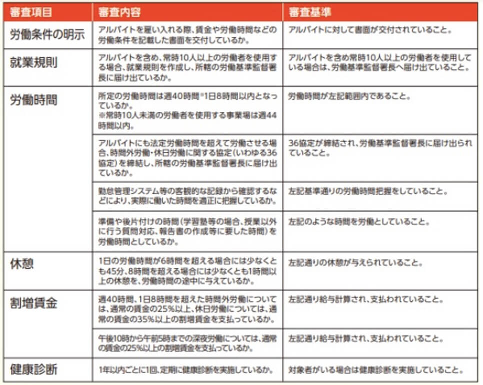 審査項目は、厚生労働省と文部科学省が示した「学生アルバイトの労働条件に関する自主点検表」に沿って策定されており、上記はその一例です。各項目の内容は下記よりご確認いただけます。