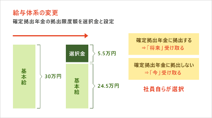 労使で給与体系の変更を話し合い、基本給の一部を「選択金」とか「資産形成手当金」とか名称をつけて基本給とは別にします。この図においては「選択金」となっていますが、その金額の上限は確定拠出年金法で決められ現在55,000円です。この55,000円の範囲で企業が上限額を決めます。「選択金」から3,000円以上1,000円単位で自分の決めた金額を拠出します。また、拠出の額も従業員自身のライフスタイルの変化に対応し、増額や減額することが可能です。拠出しない従業員は、全額を受け取ります。
