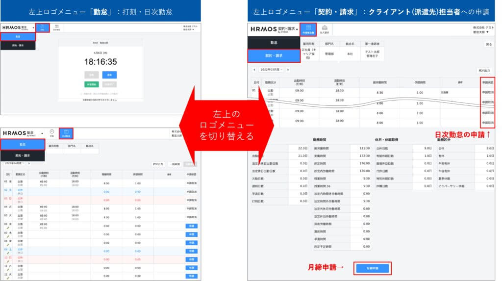 派遣スタッフやエンジニアは、派遣先(クライアント)担当者へ申請する際に、わざわざ左上ロゴメニューを切り替える必要がなくなり、日次勤怠画面からスムーズに申請ができるようになります。