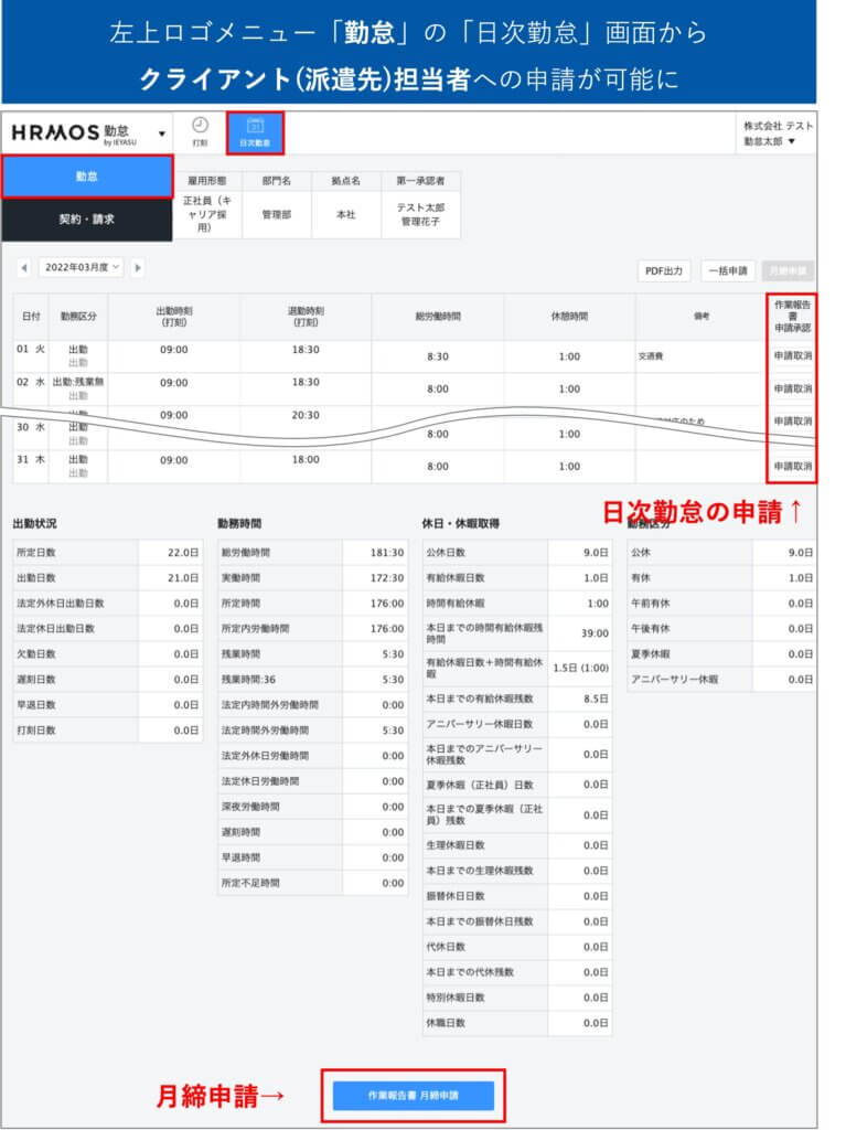 左上ロゴメニュー「勤怠」の上部メニュー「日次勤怠」画面に、派遣先(クライアント)担当者へ作業報告書を申請するための申請ボタンが表示されるようになります。