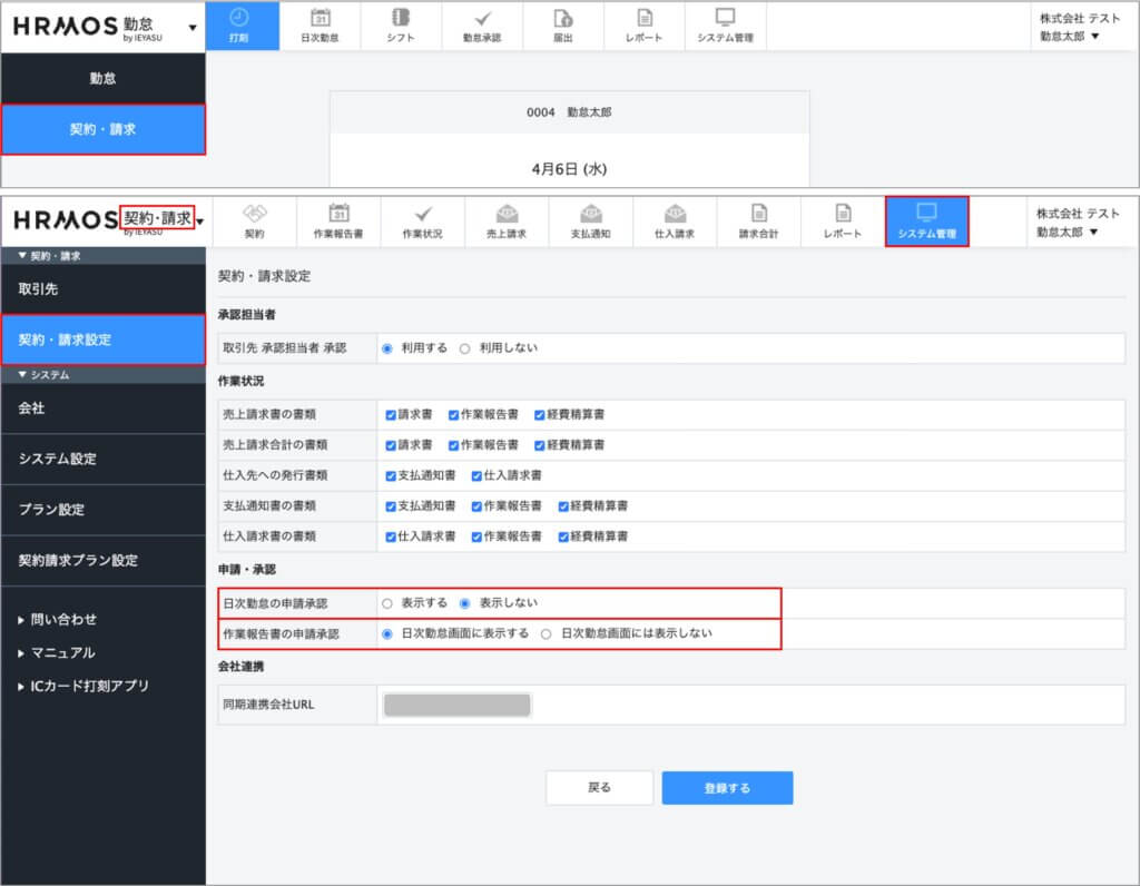 「作業報告書の申請承認」の項目で「日次勤怠画面に表示する」と設定することで、