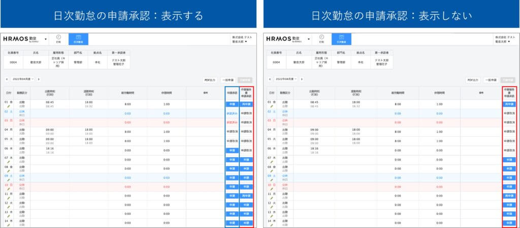 ※「表示する」と設定していた場合、自社(人材派遣会社・SES会社)の承認者へ申請するための「申請承認」列が表示されるようになります。自社の承認者による承認が不要な場合は、派遣スタッフ・エンジニアの混乱を招きますので「表示しない」と設定してください。