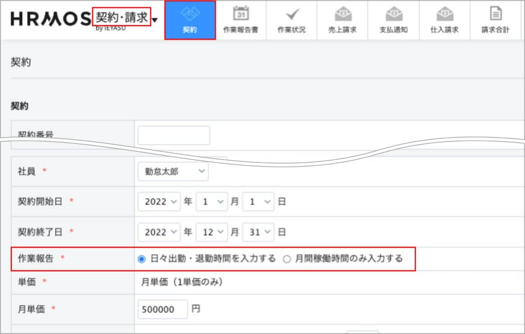 契約内容の設定画面にある「作業報告」の項目において「日々出勤・退勤時間を入力する」と設定します。