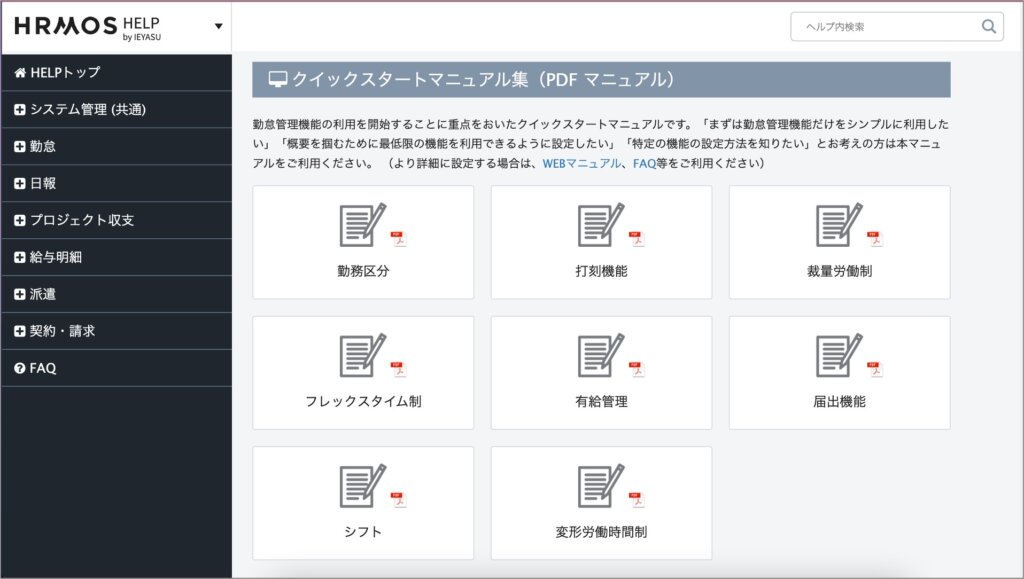 ハーモス勤怠の使い方のヘルプサイト(マニュアル)には、特定の機能の設定に重点をおいたクイックスタートマニュアル(PDF)をご用意いたしました。