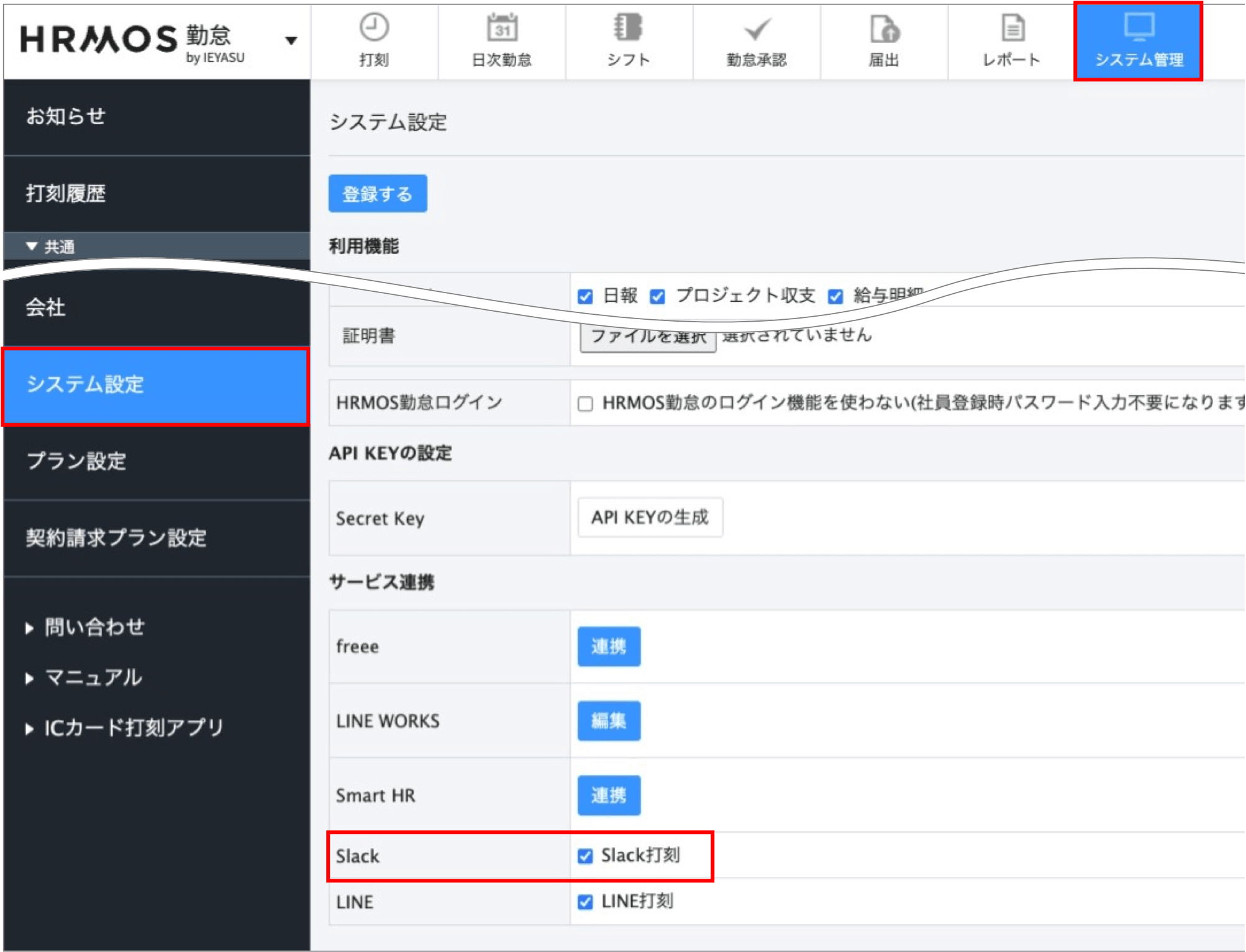 ハーモス勤怠へログイン後、[システム管理>システム設定]画面より、「slack打刻」の項目にチェックを入れ、Slack打刻を許可します。