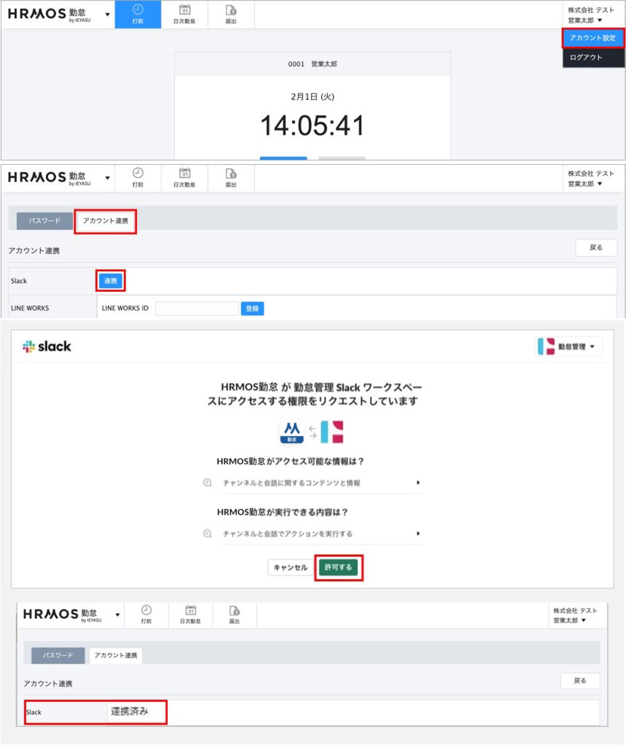 ハーモス勤怠へログイン後、[アカウント設定>アカウント連携]画面より、slack「連携」ボタンをクリックします。ハーモス勤怠と連携させたいslackのワークスペースであることを確認し「許可する」をクリックします。