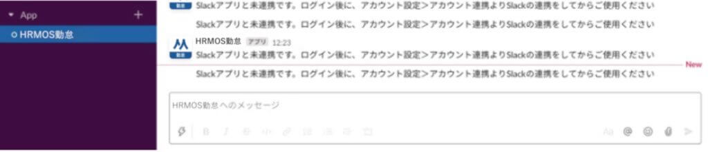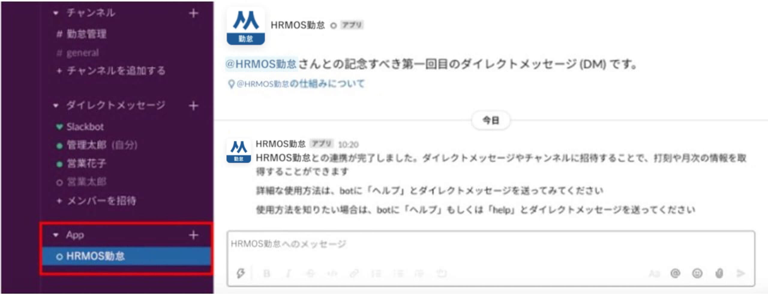 slackに移動し、サイドメニュー「App」に「HRMOS勤怠」が追加されていることを確認します。