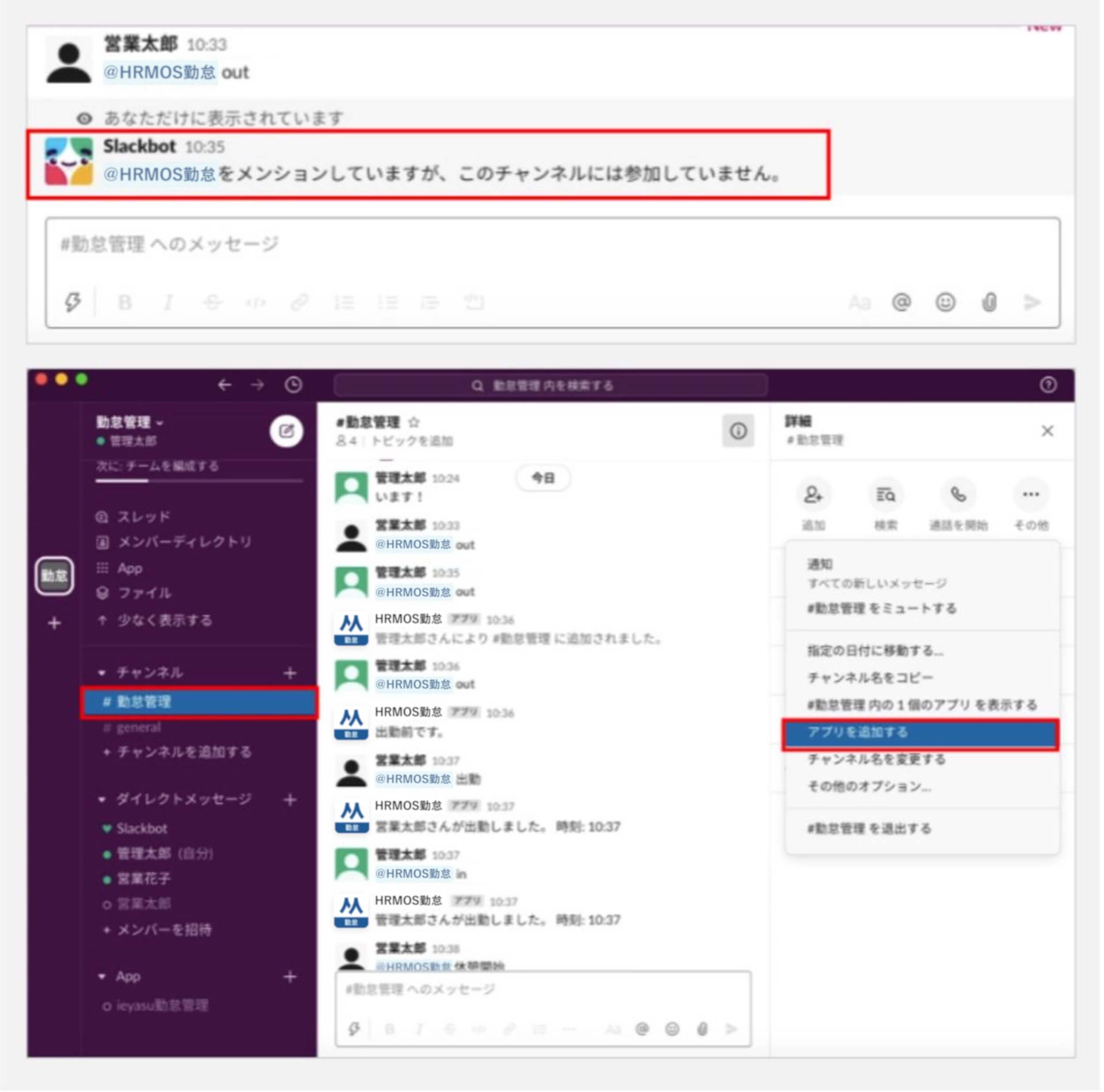 slack上で打刻や勤怠情報の確認を行う際には、メンション「@HRMOS勤怠」をつけて、テキストを入力します。チャンネルで打刻等を場合は、そのチャンネルにもアプリを追加しなければ「メンションしていますが、このチャンネルには参加していません」というメッセージが表示され、打刻等もできません。チャンネルの詳細画面の「アプリを追加する」より、チャンネルにも「HRMOS勤怠」アプリを追加してください。