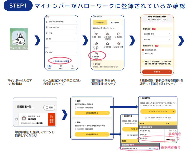 最終画面の「回答内容」に事業所名と被保険者番号が表示されない方は、マイナンバーがハローワークに登録されていない状況です。この場合、現在お勤めの事業所を通じて「個人番号登録・変更届」をハローワークに提出してマイナンバーを登録する必要があります。