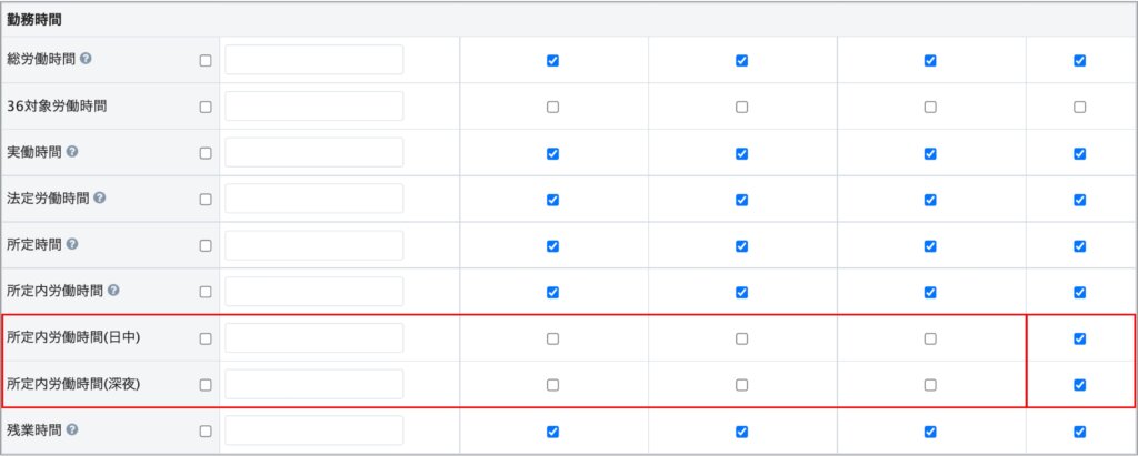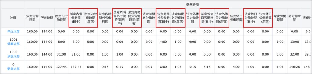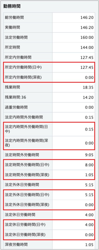 既存の項目である 「所定内労働時間」、「法定内時間外労働時間」、「法定時間外労働時間」、「法定外休日労働時間」、「法定休日労働時間」に、それぞれ「通常時間」と「深夜時間」の内訳項目を追加いたします。