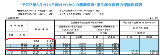 出典:協会けんぽ「令和7年3月分(4月納付分)からの健康保険・厚生年金保険の保険料額表_秋田県」
