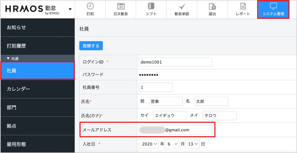 システム管理者権限のアカウントにはメールアドレスをご登録ください。