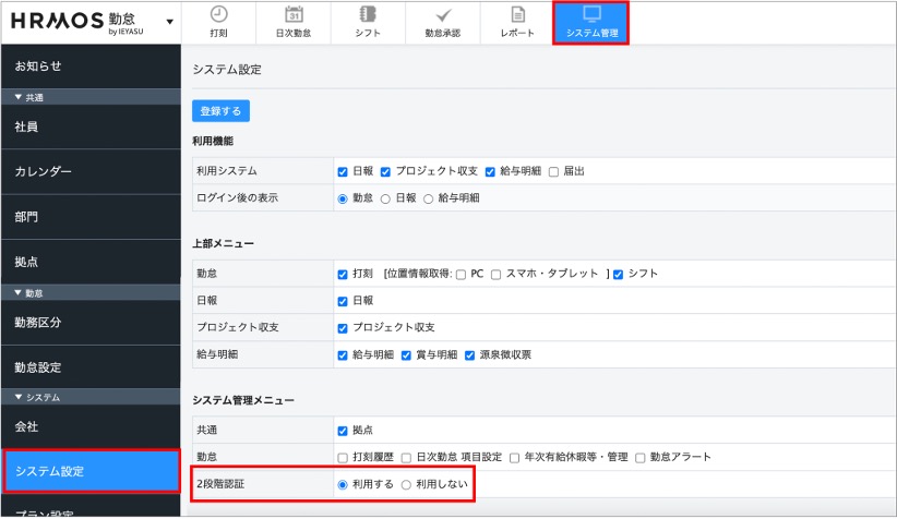 [システム管理>システム設定]画面において「2段階認証:利用する」と設定し、「登録する」ボタンをクリックします。