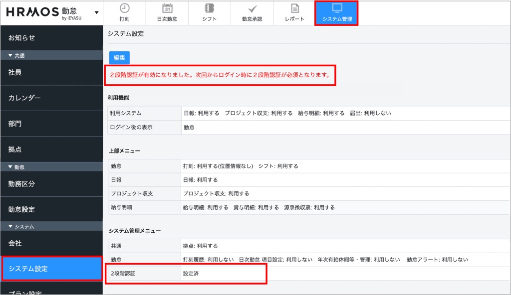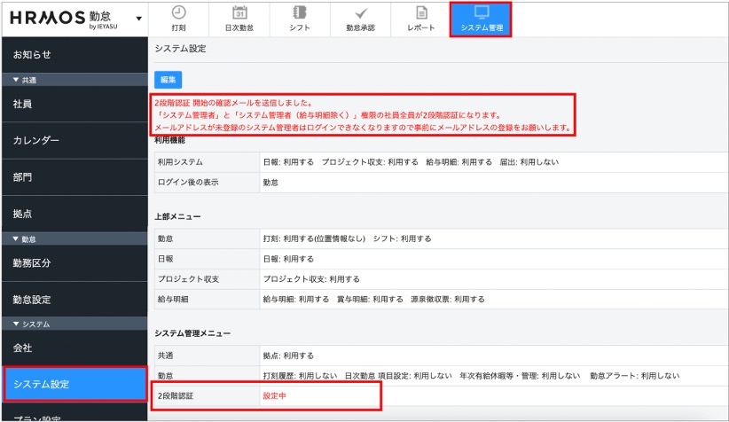 システム自体の設定・編集を行える「システム管理者」が二段階認証の対象となります。