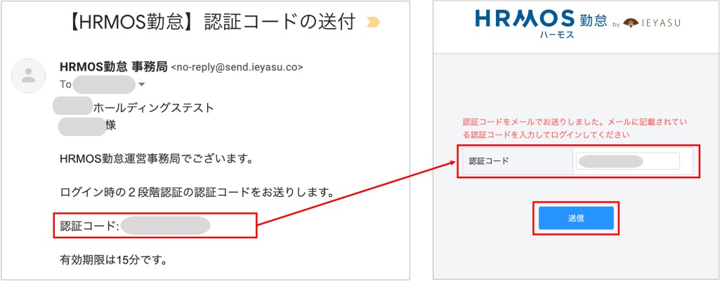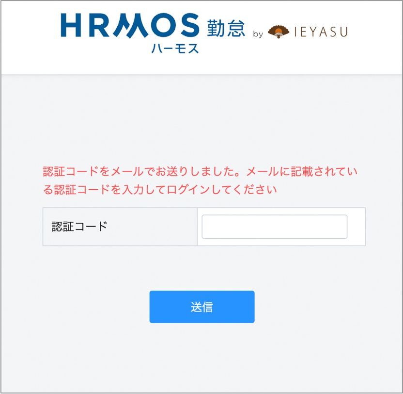 そのメールに記載されている「認証コード」を、ハーモス勤怠画面に入力し、「送信する」ボタンをクリックすることでログインできるようになります。