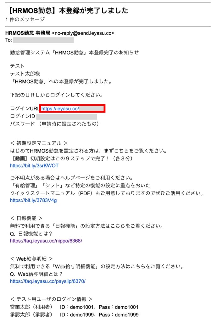 このような貴社専用のログインURLがございますので「HRMOS勤怠 事務局」からのメールをご確認ください。件名は「【HRMOS勤怠】本登録が完了しました」です。(見当たらない場合、迷惑メールフォルダもご確認ください