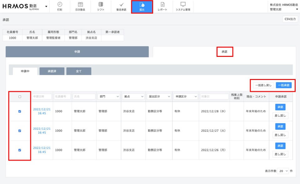 一番左側の列にチェックボックスが表示されますので、承認 or 差し戻しを行う申請にチェックを入れ、「一括承認」 or 「一括差し戻し」ボタンをクリックしてください。