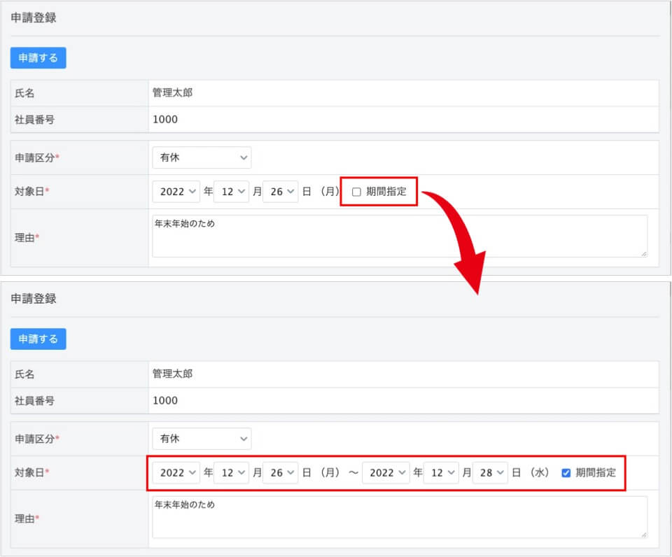 「○日~○日まで有給休暇を取得する」というように複数日にわたる申請を行う場合は、「期間指定」にチェックを入れることによって、複数の申請をまとめて行うことができます。