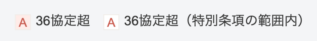 残業管理レポートや36協定レポートでは、各社員に設定された36協定の基準に応じて、超過している部分が色分けされて表示されます。