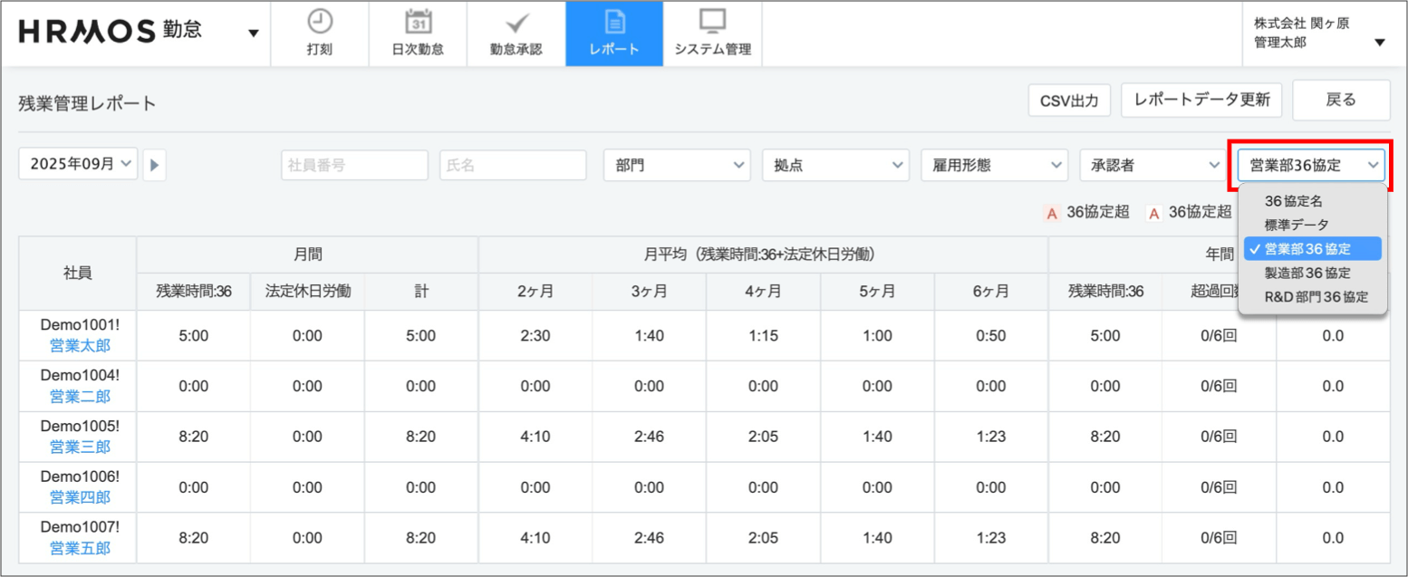 プルダウンで36協定を選択すると、その36協定が紐づいた従業員のレポートのみを絞り込んで確認できます。