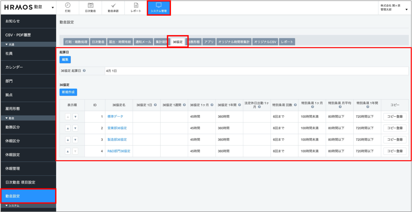 [システム管理>勤怠設定>36協定タブ]画面より、起算日と36協定の詳細を設定します。