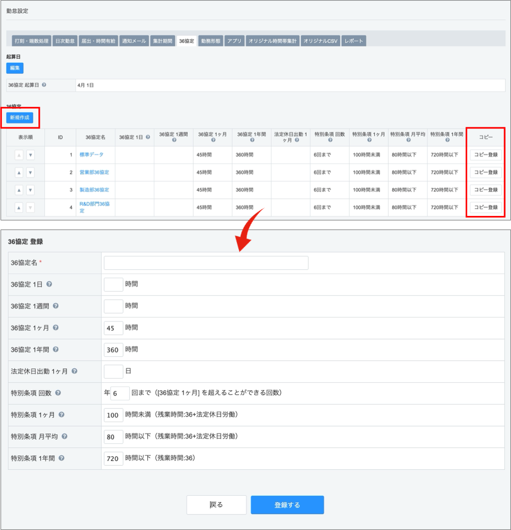 「標準データ」とは別に、新しく36協定を登録する場合は「新規作成」ボタン、もしくは「コピー登録」ボタンよりご登録ください。