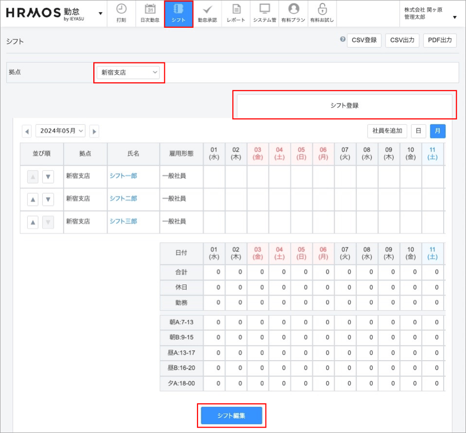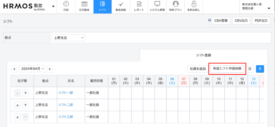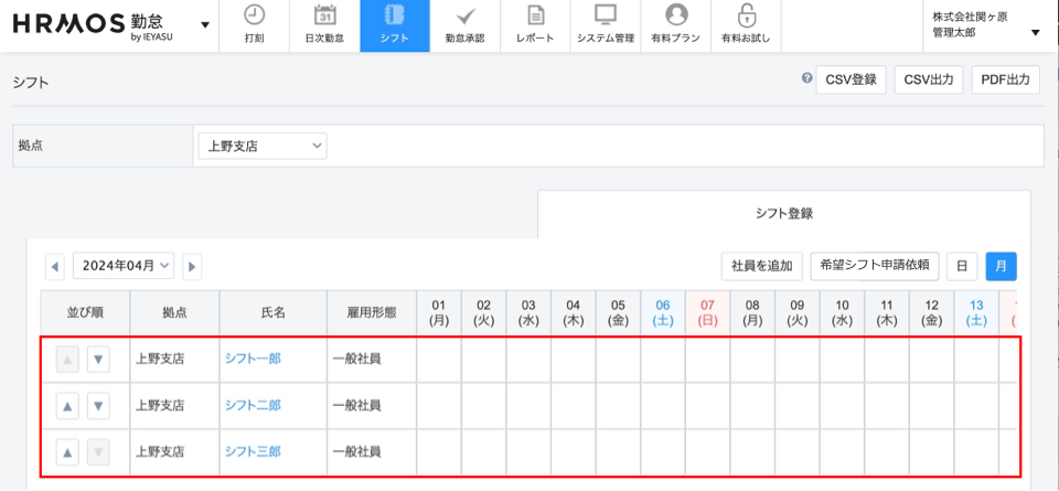 画面右上の「CSV出力」をクリックすると、1ヶ月のシフトがCSVで出力されます。