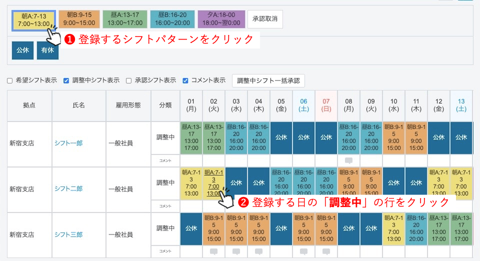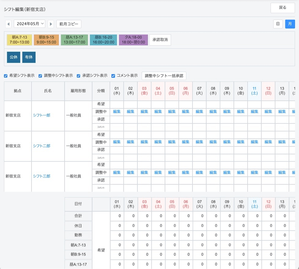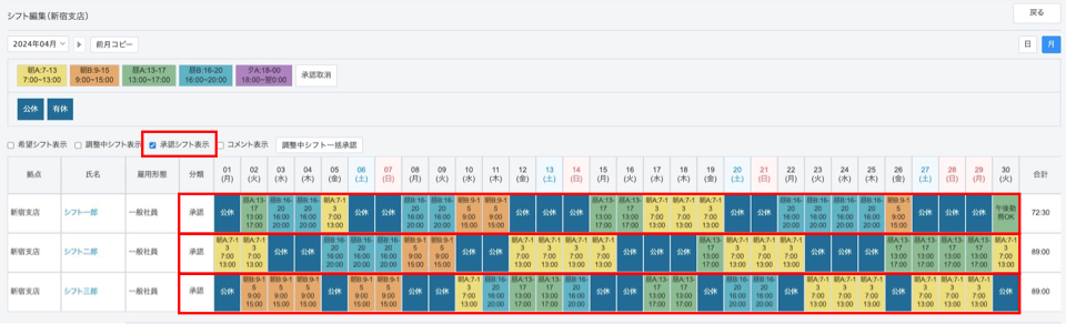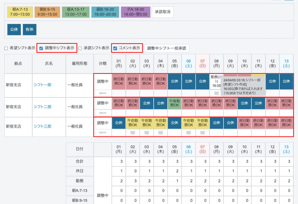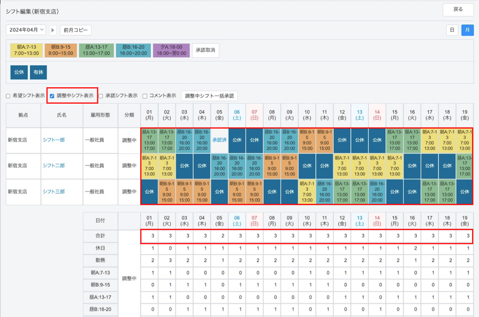 シフトを承認する前に、すべての調整中シフトが正しく登録されていることをご確認ください。画面下部・画面右部の集計欄もご活用ください。