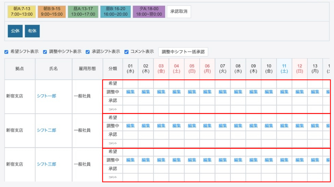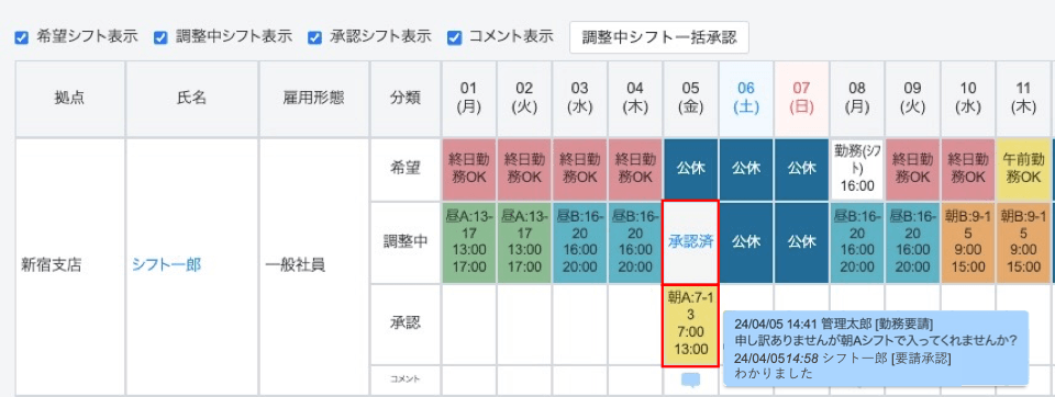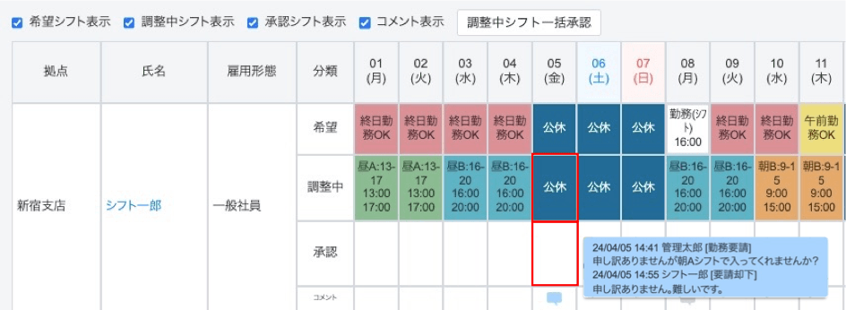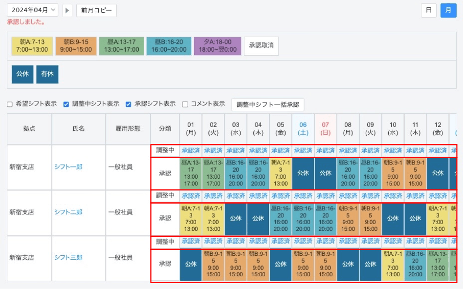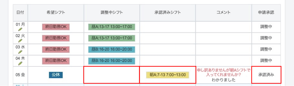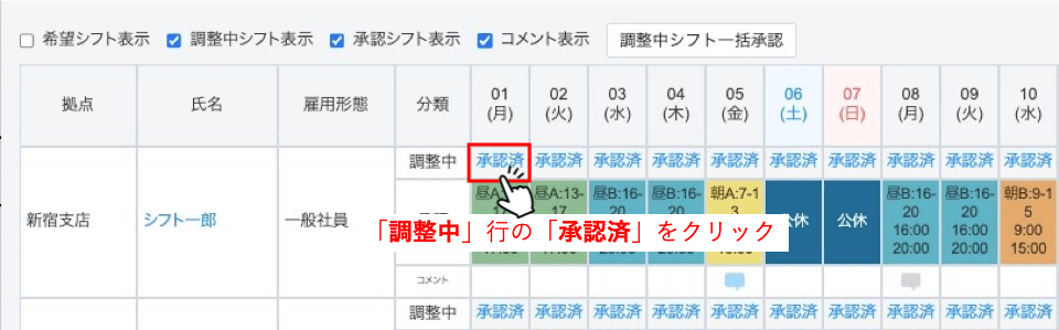 承認が完了するとシフトが「承認」行に反映され、「調整中」行には「承認済」というテキストリンクが表示されます。