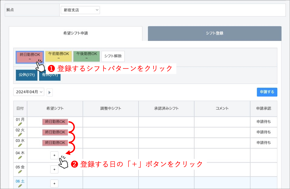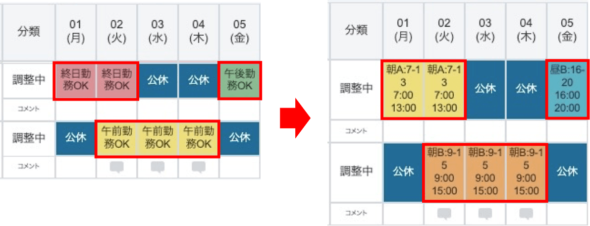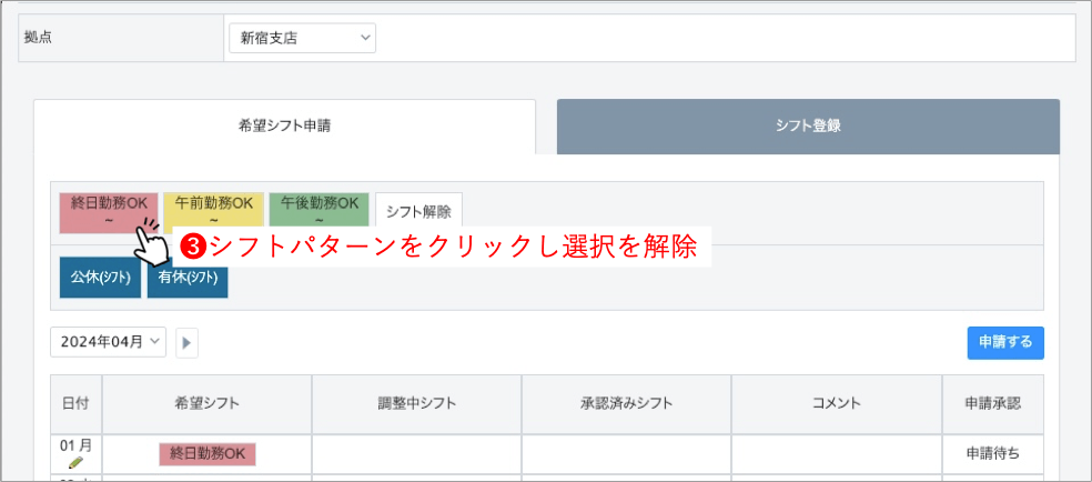 申請用の「終日勤務OK」「午前勤務OK」「午後勤務OK」のような大枠のシフトパターンを申請させる運用も可能です。