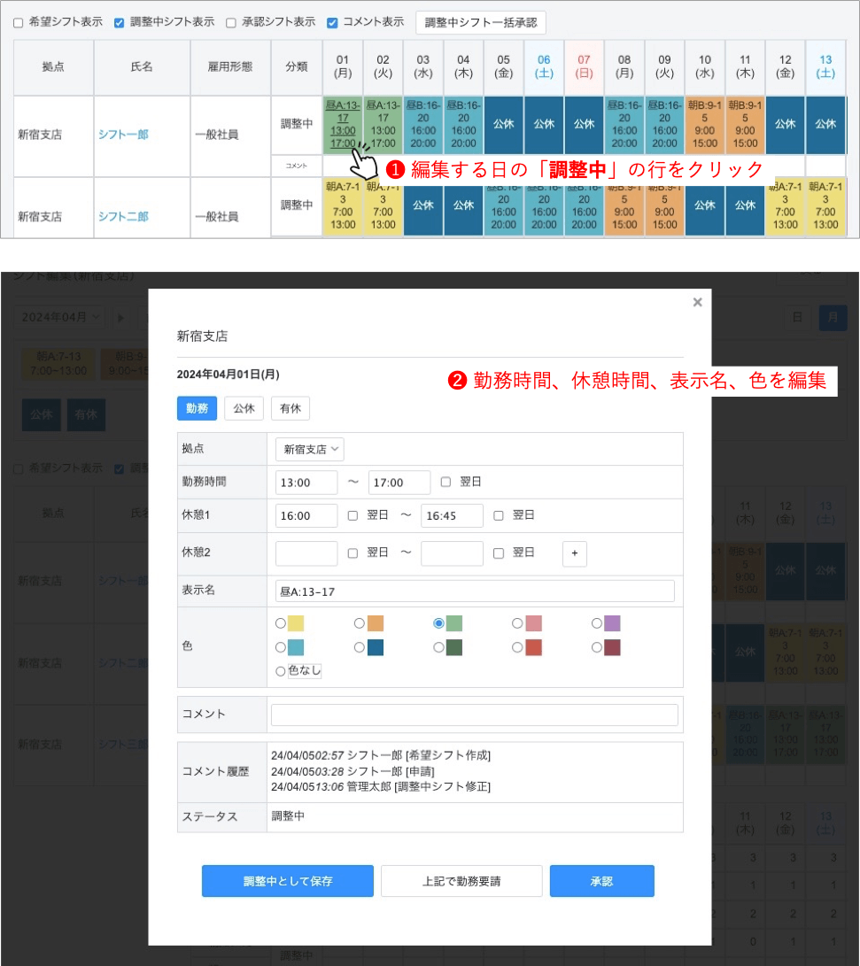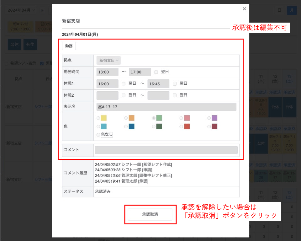 シフトを編集する必要がある場合は、一度「承認取消」をクリックし、ステータスを調整中に戻した上で編集してください。